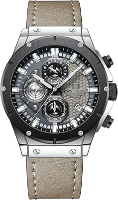 NAVIFORCE Fashion Genuine Leather Chronograph Quartz Watch for Men Auto Date Sport Waterproof Analog Wrist Watches Silver Gray